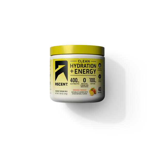 Our Orange Mango Clean Hydration + Energy contains no artificial flavors or sweeteners and only 2g of added sugar that helps increase electrolyte absorption. Ascent's Hydration + Energy powders are also: